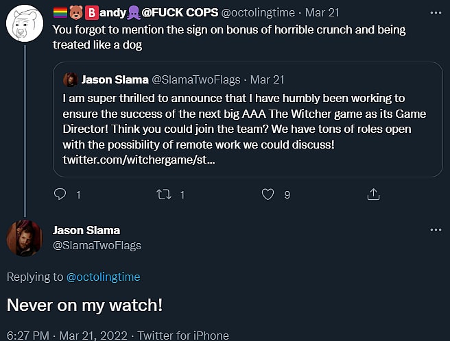 However, Twitter user @octolingtime met Slama’s call to arms with doubt, tweeting, “You forgot to mention the sign on bonus of horrible crunch and being treated like a dog.”
