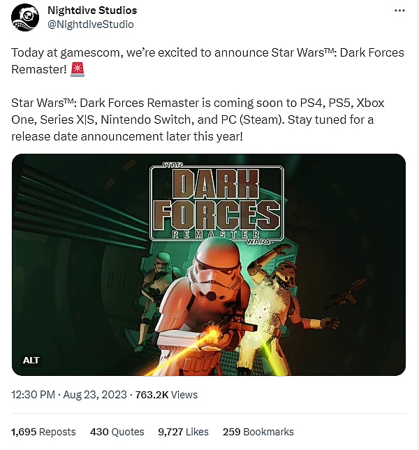 The company made the announcement at Gamescom and on X where they stated, “Today at gamescom, we’re excited to announce Star Wars: Dark Forces Remaster!”