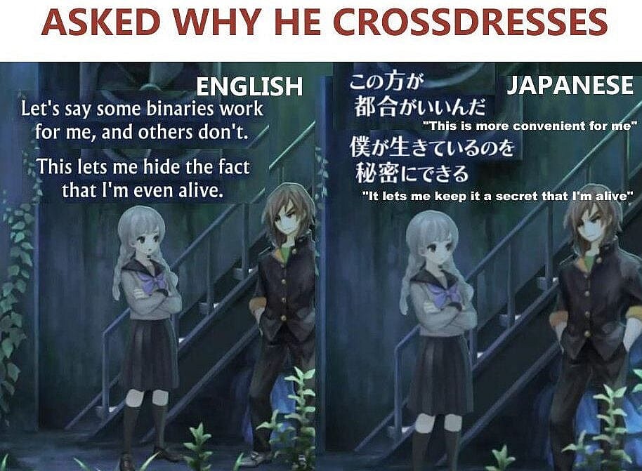 Meanwhile, in the original Japanese, Okino more accurately explains, “This is more convenient for me. It lets me keep it a secret that I’m alive.”