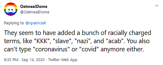 Shortly after the firmware’s release, prominent technology tinkerer and Nintendo fan @OatmealDome announced that the list of words banned from the platform was updated to include “a bunch of racially charged terms, like “KKK”, “slave”, “nazi”, and “acab”,” as well as “coronavirus” or “covid.””
