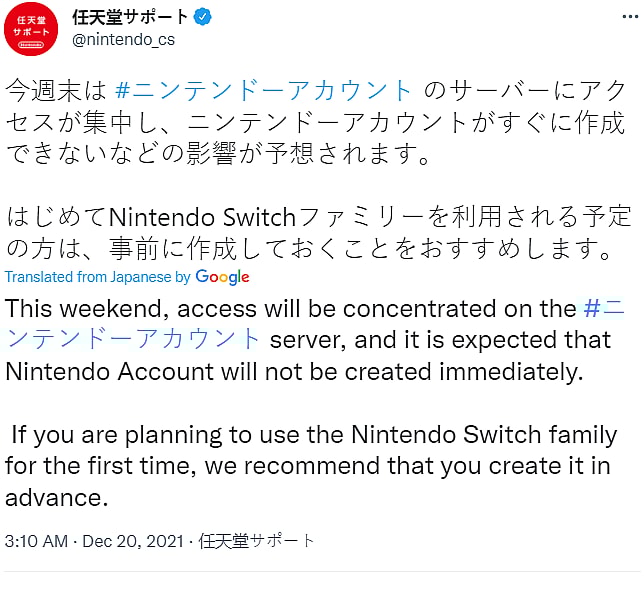 “This weekend, access will be concentrated on the [Nintendo Account] server,” the account tweeted on December 20th, “and it is expected that Nintendo Account will not be created immediately.”