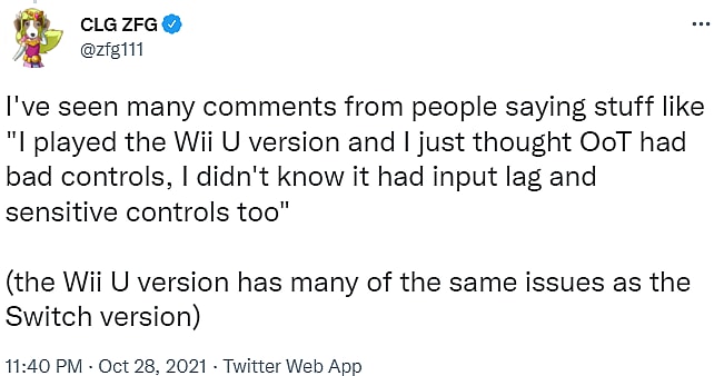“I’ve seen many comments from people saying stuff like ‘I played the Wii U version and I just thought OoT had bad controls, I didn’t know it had input lag and sensitive controls too’,” said CLG ZFG. “(The Wii U versions has many of the same issues as the Switch versions)”.
