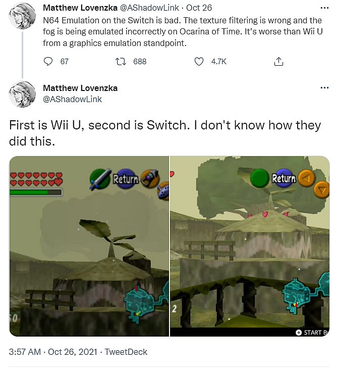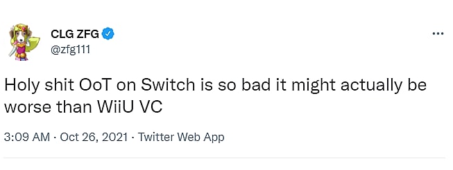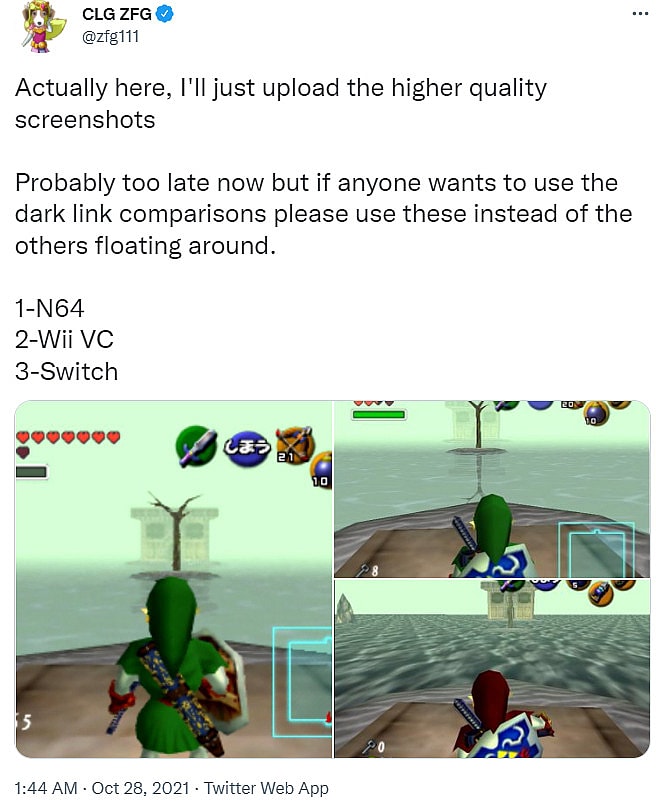 “Holy s–t OoT on Switch is so bad it might actually be worse than WiiU [Virtual Console]” ZFG tweeted alongside comparison photos of the Wii Virtual Console, Switch Online, and native N64 versions of the Zelda classic.