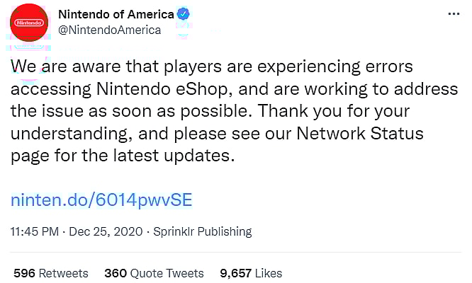 In 2020, Nintendo suffered issues with their eShop services on Christmas Day. “We are aware that players are experiencing errors accessing Nintendo eShop,” Nintendo tweeted, “and are working to address the issue as soon as possible.”