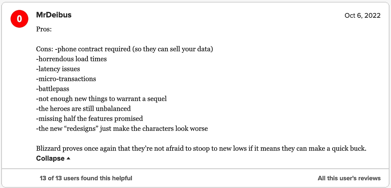 User MrDeibus was quick to point out that Overwatch 2’s pros is non-existent, proceeding to provide a list of cons that prompted them to give the title a low score, including phone contract requirements, abysmal load times, latency issues, the and widely criticized microtransactions system.