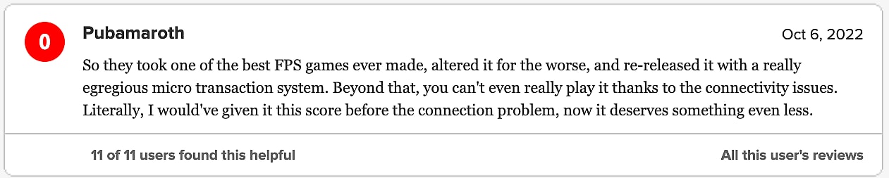 “So they took one of the best FPS games ever made, altered it for the worse, and re-released it with a really egregious micro transaction system,” decried another dissatisfied player, adding, “Beyond that, you can’t even really play it thanks to the connectivity issues. Literally, I would’ve given it this score before the connection problem, now it deserves something even less.”