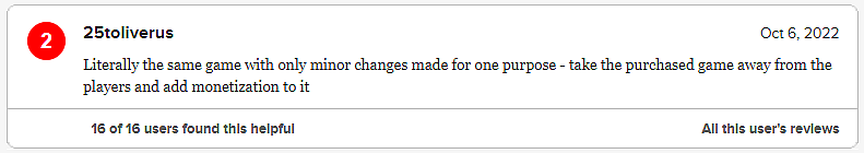 Many of the user reviews on Metacritic criticize Overwatch 2 for having minor improvements over the original, combined with the Battle Pass business model. Combined with how Overwatch was updated into Overwatch 2, one disgruntled user succinctly complained, “Literally the same game with only minor changes made for one purpose – take the purchased game away from the players and add monetization to it.”