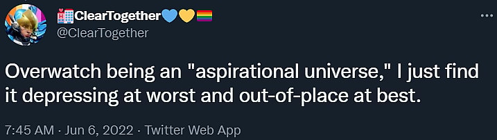 Referencing former OW lead director Jeff Kaplan’s 2016 explanation that “Our vision [for the world of Overwatch] was more a future where conflict existed, but we want a bright and aspirational vision of the future–a future that I want to live in someday,” @ClearTogether continued, “[With] Overwatch being an ‘aspirational universe, I just find it depressing at worst and out-of-place at best.”