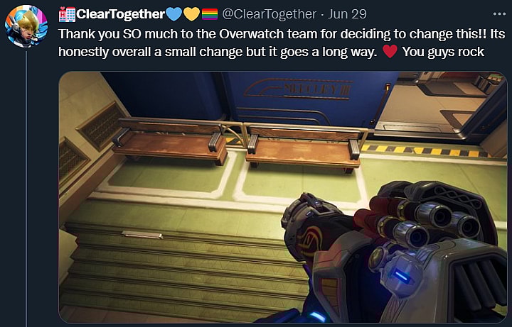 “Thank you SO much to the Overwatch team for deciding to change this!!,” praised @ClearTogether on June 29th, showing off a screenshot of the new benches. “Its honestly overall a small change but it goes a long way. You guys rock.”