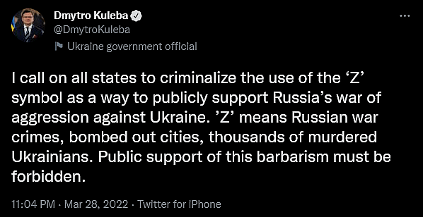“I call on all states to criminalize the use of the ‘Z’ symbol as a way to publicly support Russia’s war of aggression against Ukraine,” tweeted Ukraine Minister of Foreign Affairs Dmytro Kuleba. “’Z’ means Russian war crimes, bombed out cities, thousands of murdered Ukrainians. Public support of this barbarism must be forbidden.”