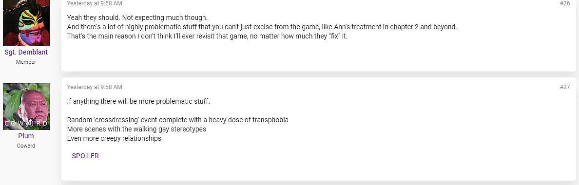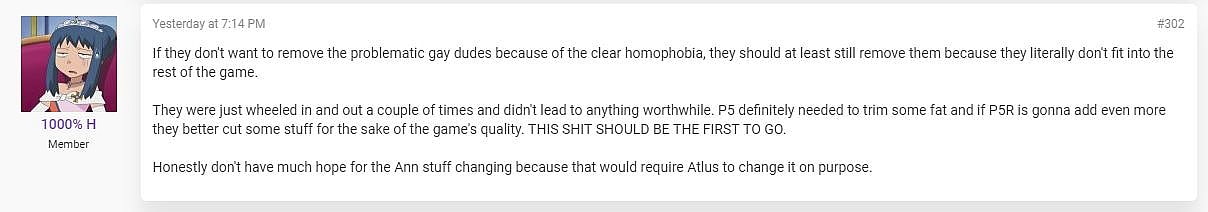 The thread, currently seven pages long, not only goes after the Kasumi character and her wardrobe, but also what they view as jokes at the expense of the LGBT community and the treatment of one of the main characters from the original Persona 5 game, Ann Takamaki .