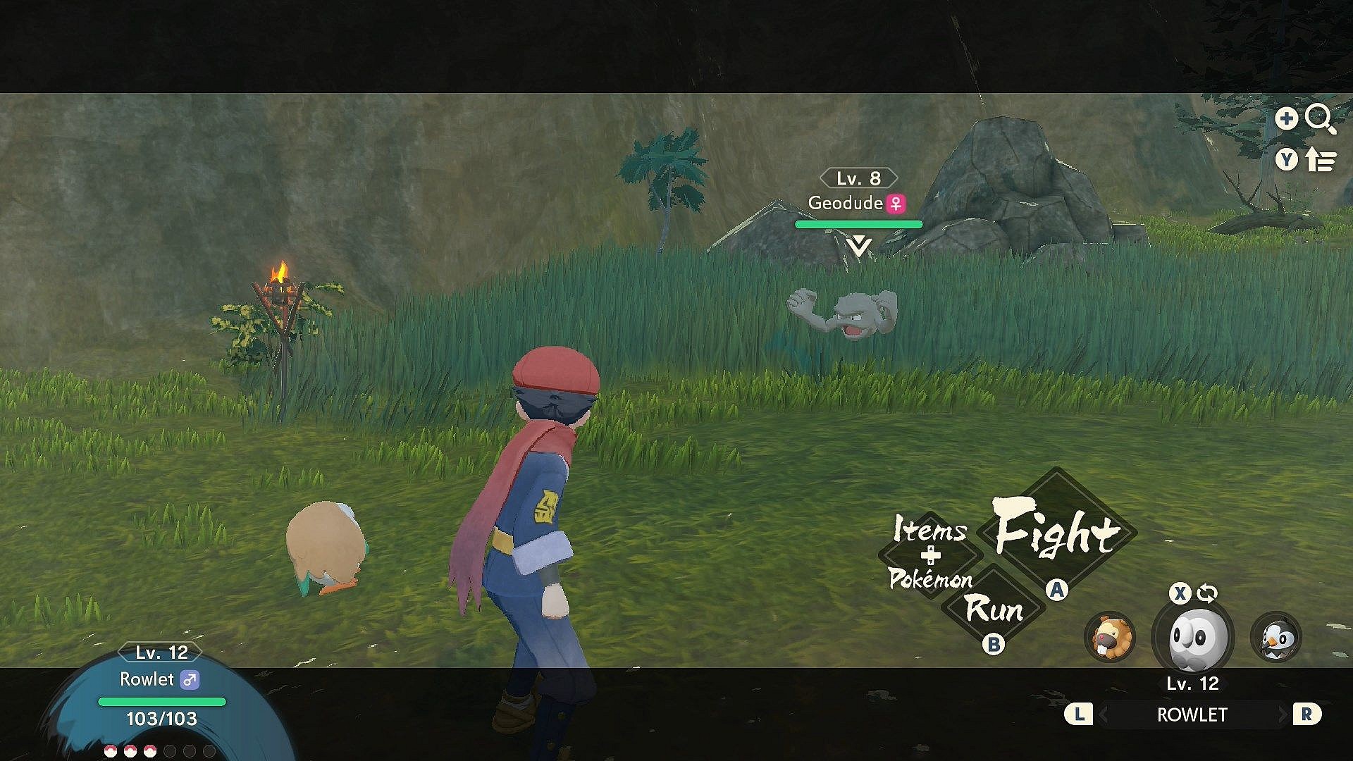 After gaining your map, you have your first battle, and then attempt to catch your first Pokémon. Players are shown freely walking around and moving the camera during battles, including during attack animations.