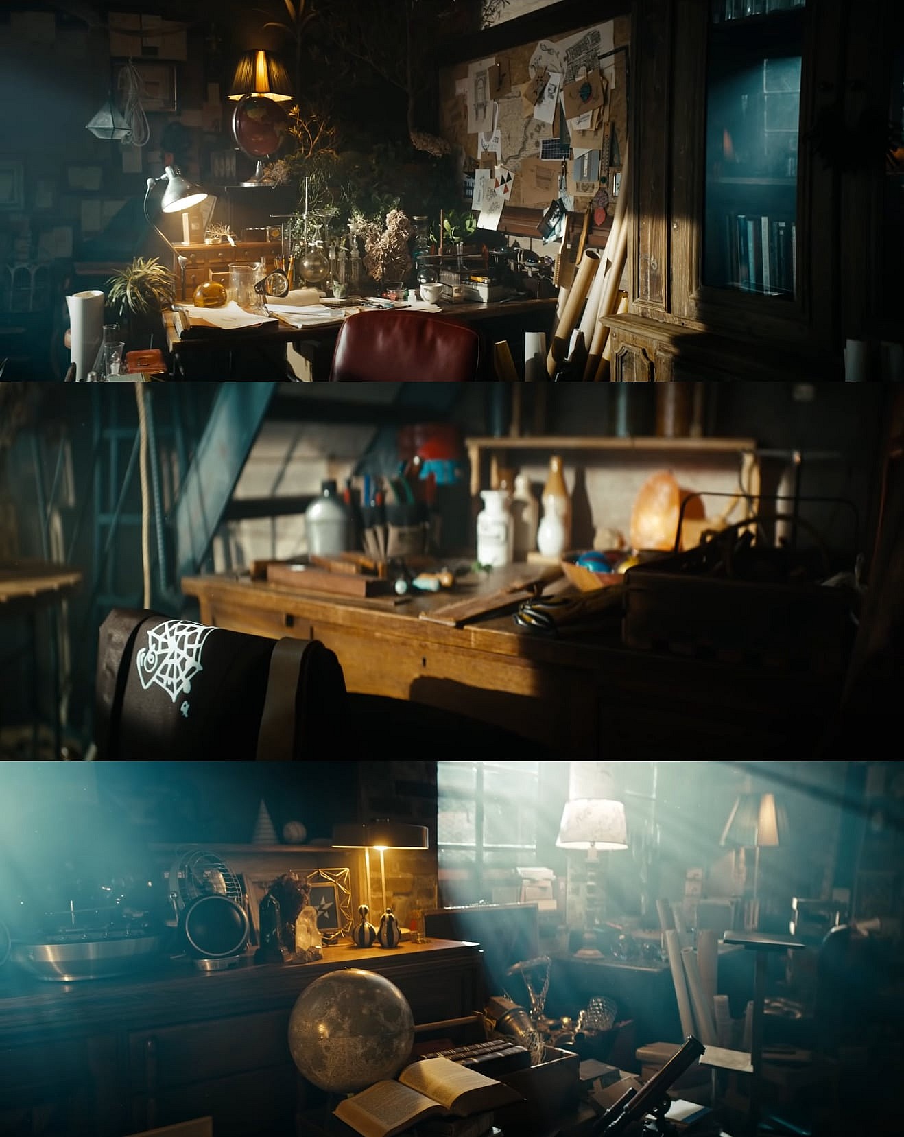 There are also some somewhat anachronistic elements in the office- aside from the Nintendo Switch consoles- such as a megaphone, and a shirt or cloth over a chair with a web-like pattern. A star broken up by a lightning bolt also appears in a framed photo and on the board.