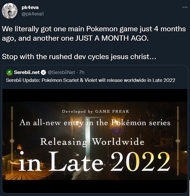 “We literally got one main Pokémon game just 4 months ago, and another one JUST A MONTH AGO,” pk4eva1 ranted, “Stop with the rushed dev cycles jesus christ…”