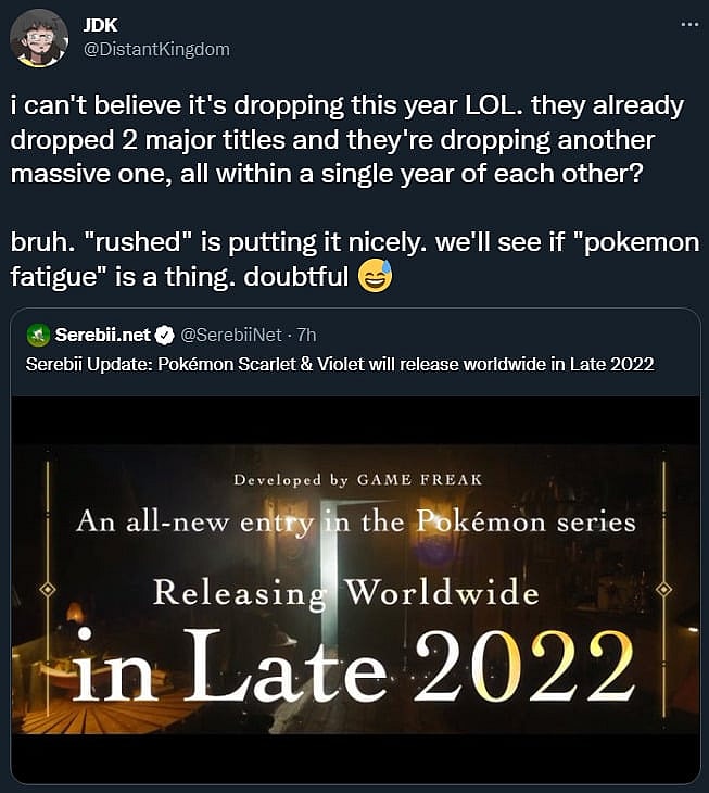 “Bruh,” DistantKingdom concluded, ‘rushed’ is putting it nicely. we’ll see if ‘pokemon fatigue’ is a thing. doubtful [laughing and sweating emoji]”