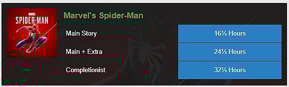 For comparison’s sake, Marvel’s Spider-Man, How Long To Beat details that the main story of Marvel’s Spider-Man takes 16.5 hours to complete. The main story and extra content takes around 24.5 hours and for completionists its takes around 32.5 hours.