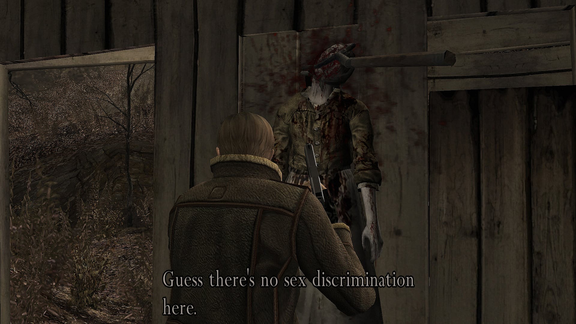 Another scene of Leon discovering the corpse of an impaled women was also changed, from “Guess there’s no sex discrimination around here,” to “I guess no one’s safe here.”