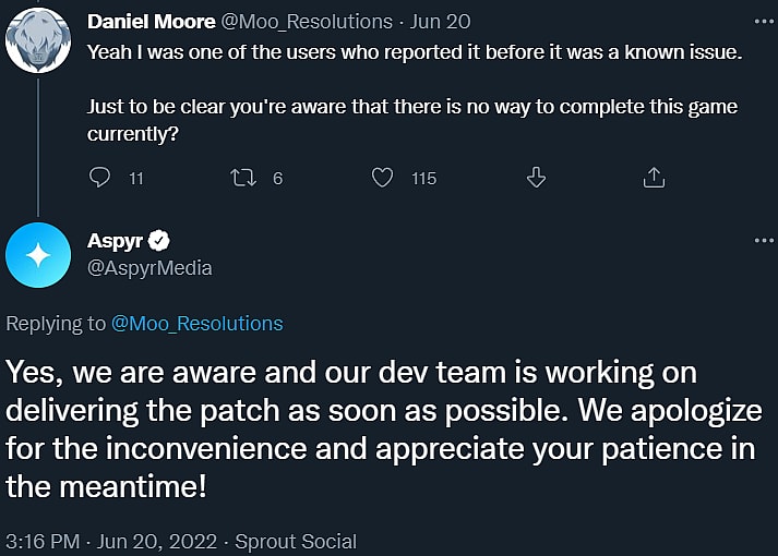 “Yeah I was one of the users who reported it before it was a known issue,” @Moo_Resolutions claimed in reply. “Just to be clear you’re aware that there is no way to complete this game currently?”