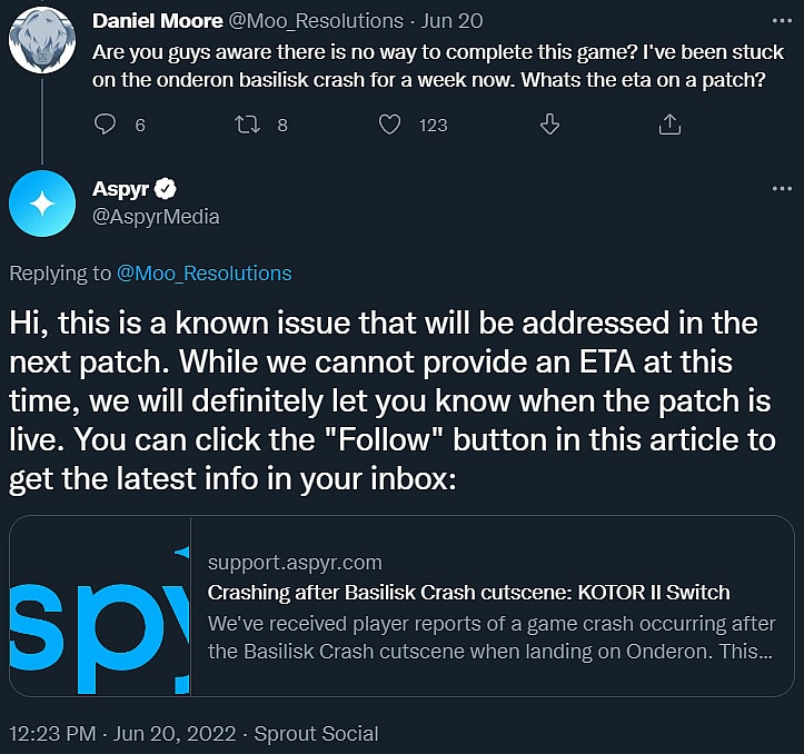 “Are you guys aware there is no way to complete this game?” inquired @Moo_Resolutions. “I’ve been stuck on the onderon basilisk crash for a week now. Whats the eta on a patch?”