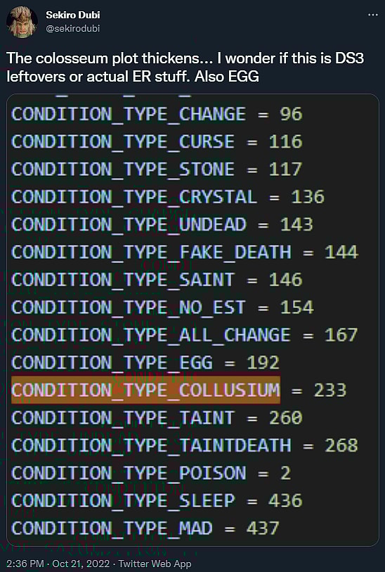 Code stating “CONDITION_TYPE_COLLUSIUM” would further support this claim. “The colosseum plot thickens… I wonder if this is DS3 leftovers or actual ER stuff,” @sekirodubi mused. “Also EGG.” What the “egg” condition could entail is currently unclear.