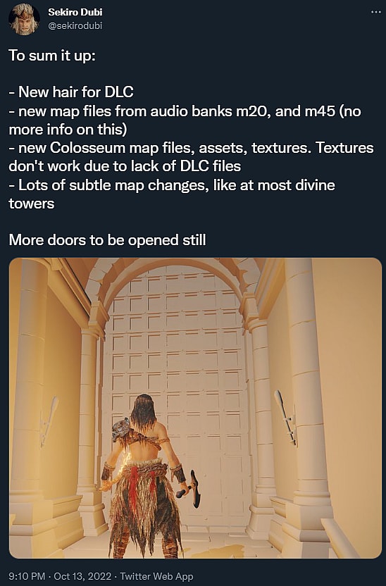 Dexerto also cited dataminer @sekirodubi, who shared what they had found in October. The user summarized these findings as “New hair for DLC, new map files from audio banks m20, and m45 (no more info on this), new Colosseum map files, assets, textures, and Lots of subtle map changes, like at most divine towers,” pointing out, however, that “Textures don’t work due to lack of DLC files,” and added that “More doors to be opened still.”