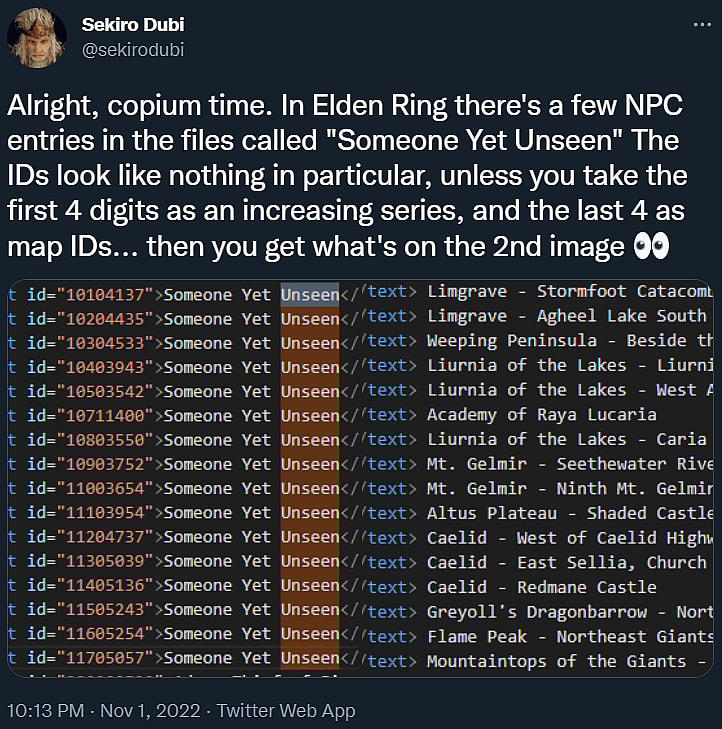 “Alright, copium time. In Elden Ring there’s a few NPC entries in the files called ‘Someone Yet Unseen’, @sekirodubi explains. “The IDs look like nothing in particular, unless you take the first 4 digits as an increasing series, and the last 4 as map IDs… then you get what’s on the 2nd image.” The images show sixteen different IDs, each associated with locations in Limgrave, Mt. Gelmir, and more.