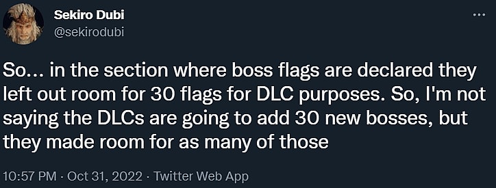 @sekirodubi also made a claim that could be shocking at first glance, asserting, “So… in the section where boss flags are declared they left out room for 30 flags for DLC purposes. So, I’m not saying the DLCs are going to add 30 new bosses, but they made room for as many of those.”