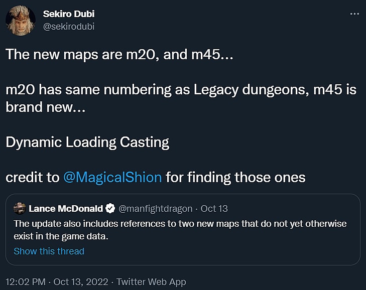 Using more technical terms, @sekirodubi responded to McDonald’s original thread, “The new maps are m20, and m45… m20 has same numbering as Legacy dungeons, m45 is brand new… Dynamic Loading Casting,” crediting Twitter user @MagicalShion for those findings.