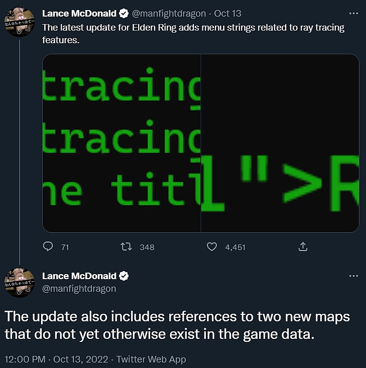 “The latest update for Elden Ring adds menu strings related to ray tracing features,” McDonald explained. He later added that his datamining efforts uncovered “The update also includes references to two new maps that do not yet otherwise exist in the game data.”