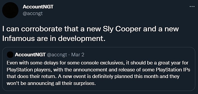 In a follow-up tweet, @accngt affirmatively declared, “I can corroborate that a new Sly Cooper and a new InFamous are in development.