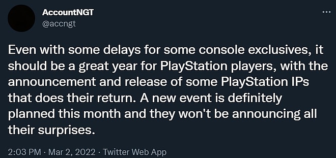“Even with some delays for some console exclusives, it should be a great year for PlayStation players, with the announcement and release of some PlayStation IPs that does their return,” @accngt claimed on March 2nd. “A new event is definitely planned this month and they won’t be announcing all their surprises.”