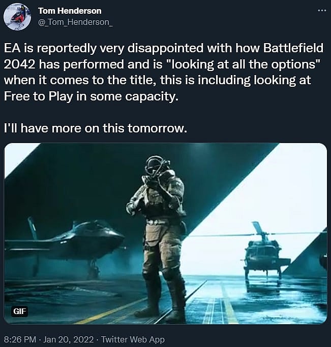 On January 20th, Henderson reported via his personal Twitter account that not only was EA”very disappointed with how Battlefield 2042 has performed”, but that the company was “‘look at all the options’ when it comes to the title.”