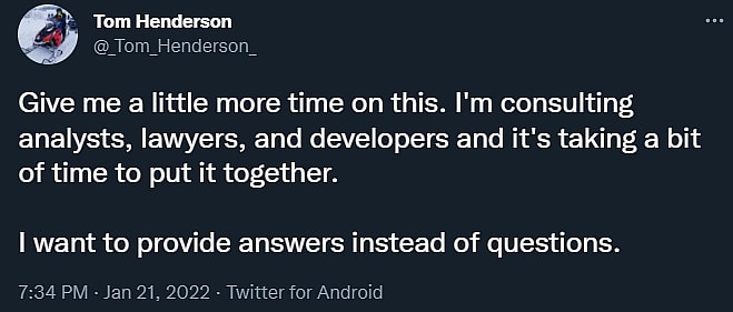“I’m consulting analysts, lawyers, and developers and it’s taking a bit of time to put it together,” he explained. “I want to provide answers instead of questions.”