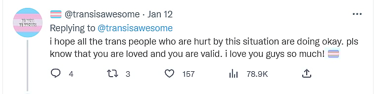 Later @transisawesome continued “i hope all the trans people who are hurt by this situation are doing okay. pls know that you are loved and you are valid. i love you guys so much!”
