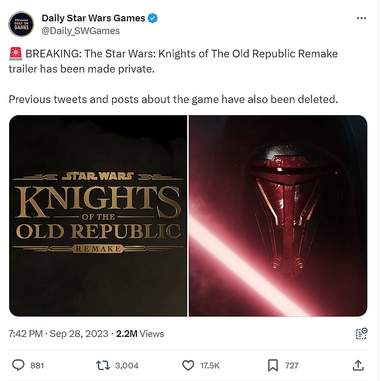 X account Daily Star Wars Games reported earlier this week that Sony and PlayStation had privated the Star Wars: Knights of the Old Republic Remake trailer as well as deleting numerous tweets about the game.