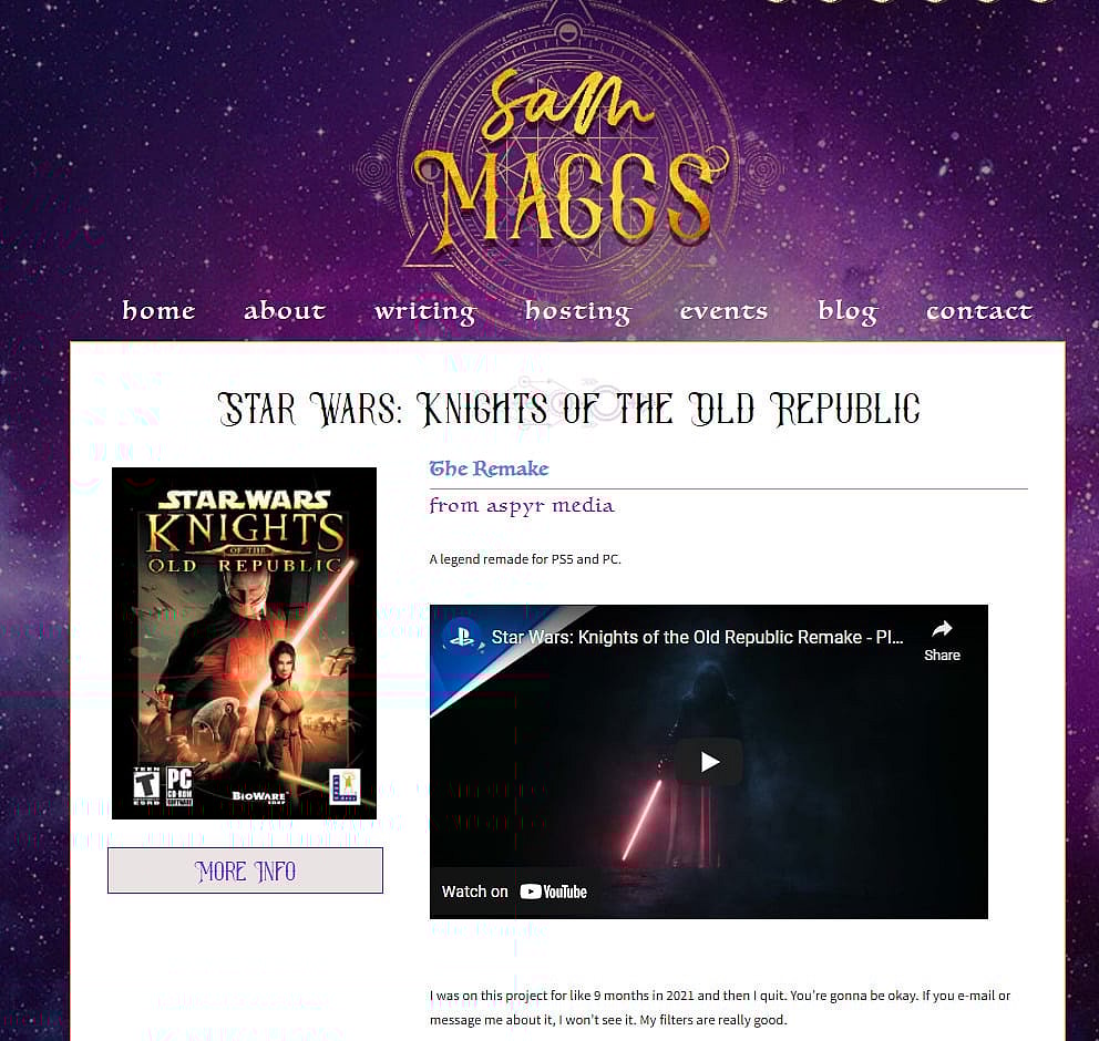 Maggs announced her involvement on Twitter sharing a video of her updating her Twitter profile with Knights of the Old Republic.