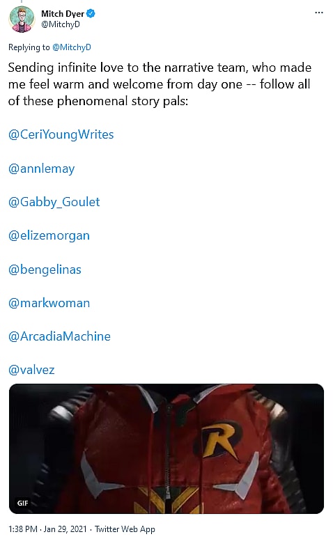 The Gotham Knights writer then sent “infinite love to the narrative team, who made me feel warm and welcome from day one,” revealing the membership of several additional writers on said narrative team.