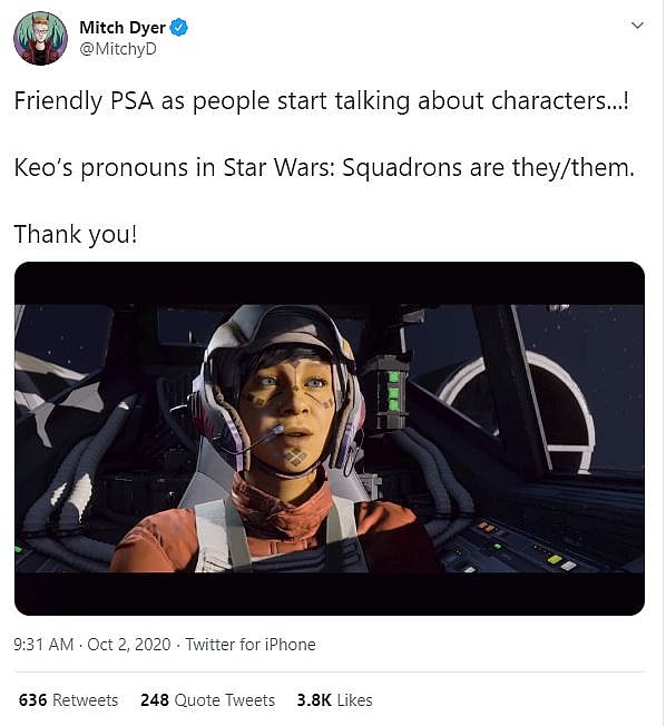 As noted above, Dyer drew widespread attention last year after he issued a “friendly PSA” to Star Wars: Squadrons players that “Keo’s Pronouns in Star Wars: Squadrons are they/them”.