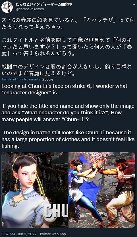 “Looking at Chun-Li’s face on STR6, I wonder what [a] “character designer” is,” pondered @daranekogames. “If you hide the title and name and show only the image and ask ‘What character do you think it is?’, How many people will answer ‘Chun-Li’?”