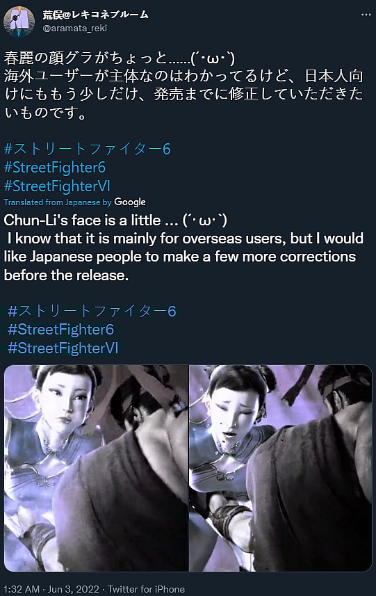 “Chun-Li’s face is a little… (´・ω・`)” noted @aramata_reki. “I know it’s mainly for overseas users, but I’d like to see it fixed for Japanese users as well, just a little bit more, before the release of the game.”