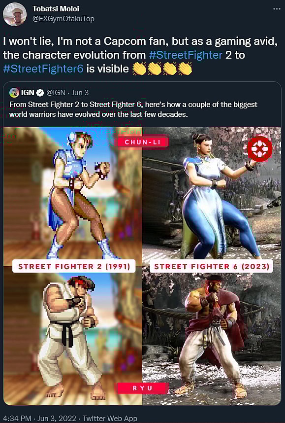 “I won’t lie, I’m not a Capcom fan, but as a gaming avid, the character evolution from #StreetFighter 2 to #StreetFighter6 is visible,” applauded @EXGymOtakuTop