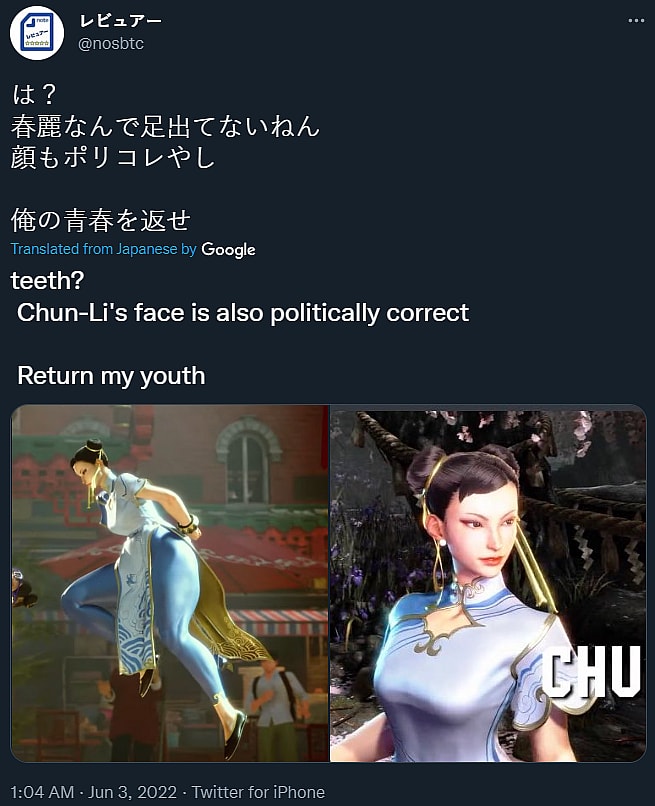 “Huh? Why isn’t Chun-Li showing her legs?” asked @nosbtc (via DeepL). “And her face is so ‘politically correct’. Return her youth.”