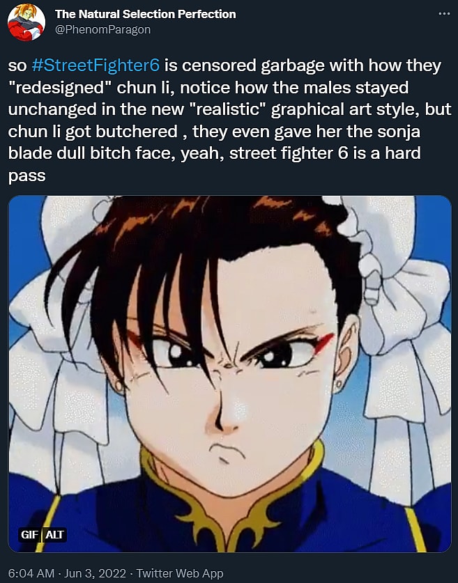 “So #StreetFighter6 is censored garbage with how they ‘redesigned’ chun li,” proposed @PhenomParagon “notice how the males stayed unchanged in the new ‘realistic'” graphical art style, but chun li got butchered , they even gave her the sonja blade dull b—h face, yeah, street fighter 6 is a hard pass.”