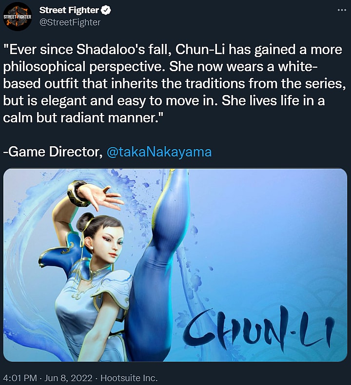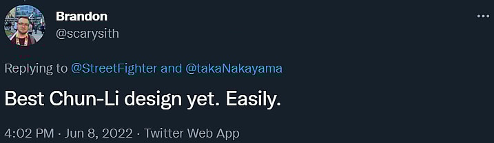 Replying to the official Street Fighter 6 Twitter’s post about the character, @scarysith declared, “Best Chun-Li design yet. Easily.”