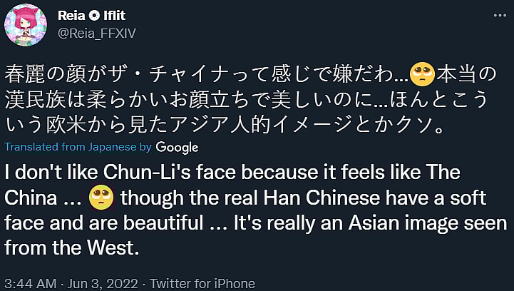 “I hate the way Chun-Li’s face looks so typically Chinese,” lamented @Reia_FFXIV. “The real Han Chinese have soft and beautiful faces…This kind of Western image of Asian people is really s—-y.”