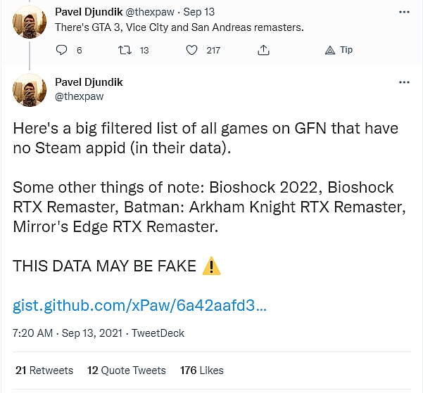 “Here’s a big filtered list of all games on GFN that have no Steam appid (in their data),” Djundik said. “Some other things of note: Bioshock 2022, Bioshock RTX Remaster, Batman: Arkham Knight RTX Remaster, Mirror’s Edge RTX Remaster.”
