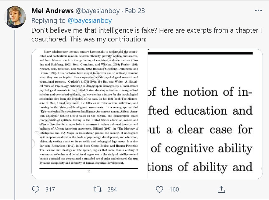 “Don’t believe me that intelligence is fake? Here are excerpts from a chapter I coauthored. This was my contribution, ” the user tweeted.