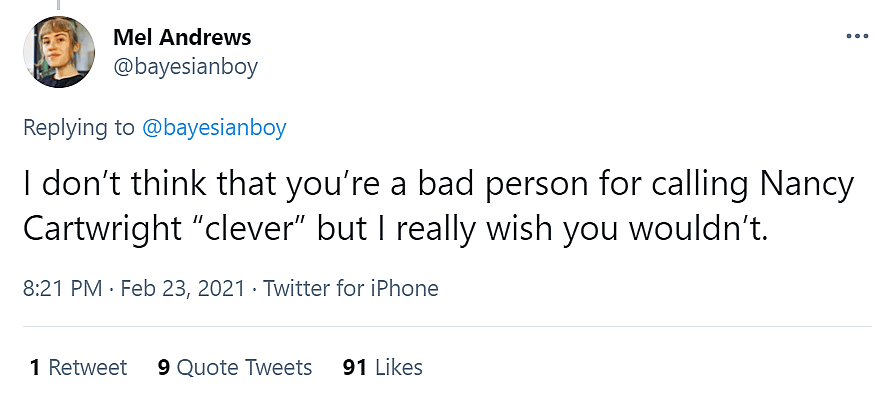 Next the user added, “I don’t think that you’re a bad person for calling Nancy Cartwright ‘clever’ but I really wish you wouldn’t.”