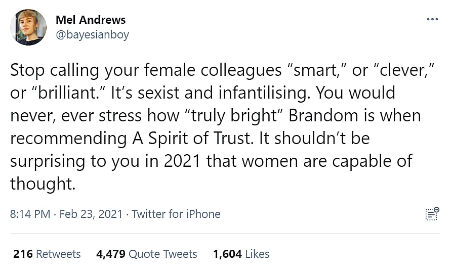 They wrote, “Stop calling your female colleagues ‘smart,’ or ‘clever,’ or ‘brilliant.’ It’s sexist and infantilising. You would never, ever stress how ‘truly bright’ Brandom is when recommending A Spirit of Trust.”
