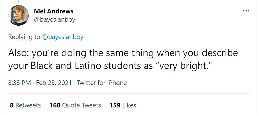 In a subsequent tweet the user wrote, “Also: you’re doing the same thing when you describe your Black and Latino students as ‘very bright.'”